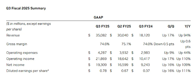 新华财经北京11月21日电(王媛媛)美国当地时间周三,芯片巨头英伟达发布了截至2024年10月27日的2025财年第三财季(对应自然年2024年第三季度)财报。财报显示,英伟达第三财季营收为350.82亿美元,同比增长94%,环比增长17%;净收入193.09亿美元,同比增长109%;摊薄后每股收益为0.78美元,较上年同期增长111%。