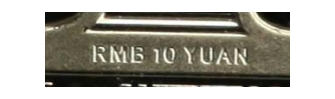 在硬币正面面额数字“10”的底端,可观察到“RMB 10 YUAN”的微缩文字。防伪特征效果见图4。