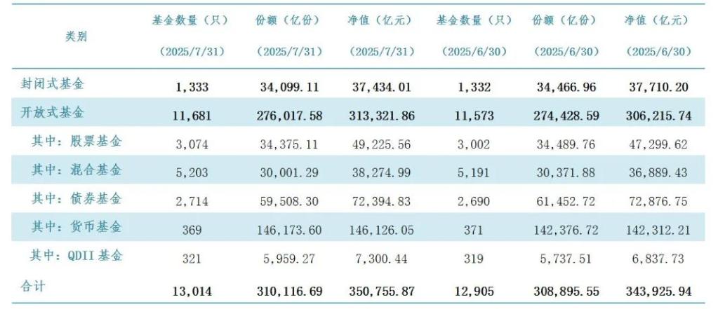 中国基金业协会最新发布的数据显示,截至2025年7月底,境内公募基金资产净值规模合计35.08万亿元。