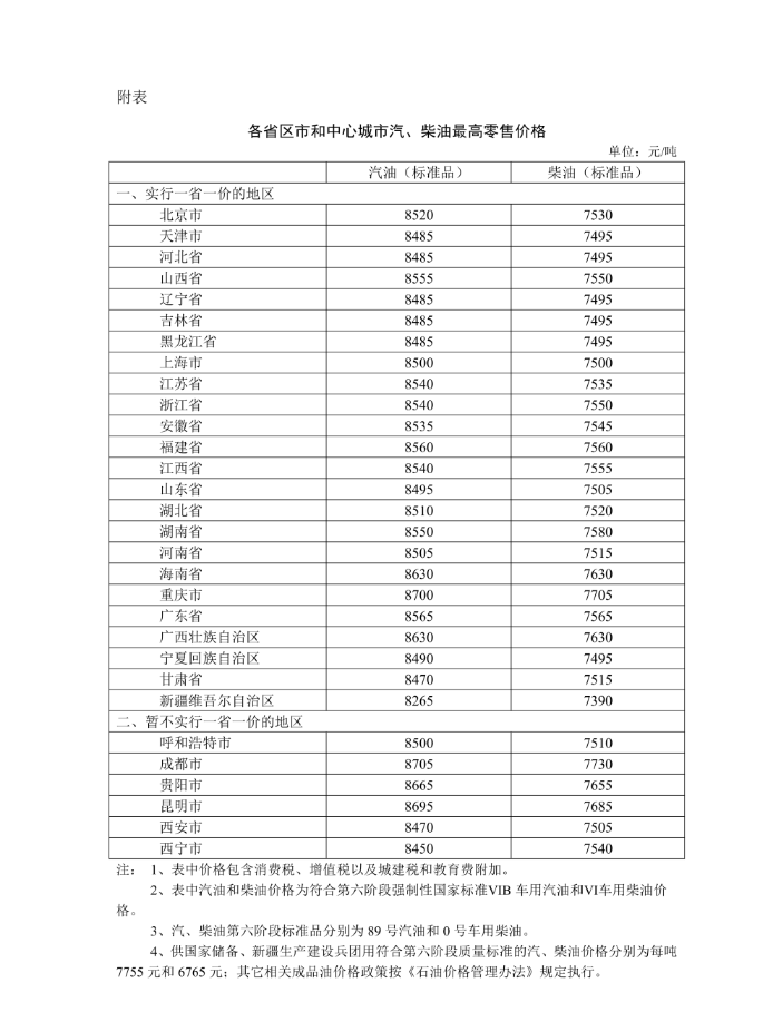 近期国际市场油价波动运行,根据10月27日的前10个工作日平均价格与上次调价前10个工作日平均价格对比情况,按照现行成品油价格机制,自10月27日24时起,国内汽、柴油价格(标准品,下同)每吨分别降低265元和255元。调整后,各省(区、市)和中心城市汽、柴油最高零售价格见附表。