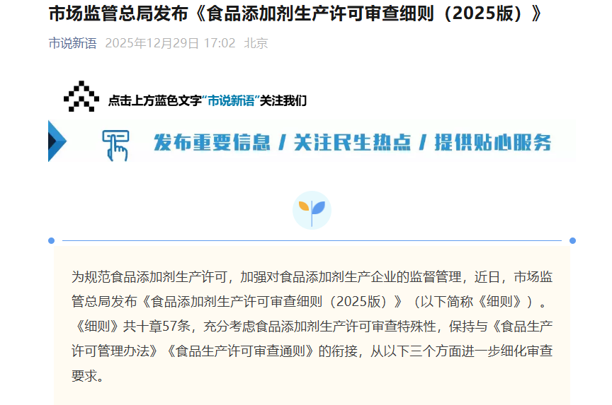 市场监管总局发布《食品添加剂生产许可审查细则(2025版)》