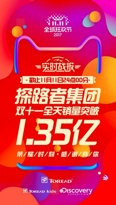 探路者集团以1.35亿华丽收官 2017年双十一再创新高