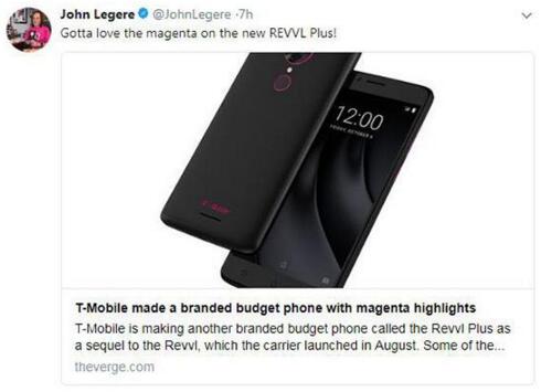 值得一提的是,在手机厂商大打“颜色牌”之时,REVVL PLUS也在后置镜头的外圈以及指纹识别按键上进行了前卫的酒红色渲染勾勒,成为该机在外在设计上的一抹亮眼的流行元素。与此同时T-Mobile美国CEO John Legere发推文表达了对新机REVVL PLUS配色设计的喜爱。