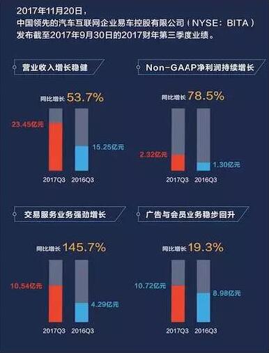 易车20日晚发布的2017年第三季度财报显示,营收为23.45亿美元,同比增长53.7%。Non-GAAP净利润人民币2.32亿元,同比增长78.5%。