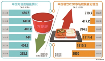 今年以来,国内方便面市场连续三年销售下滑的局面得到遏制,行业利润甚至略有上升,特别是零售价较高的高端面被行业视为“救命稻草”。不过,提高了价位的高端方便面,最直接的竞争对手就是快餐,尤其是网络外卖。虽然在价格上不占优势,但网络送餐在口味、饭菜量上显然都要远胜过方便面,能否在竞争中胜出,或将决定方便面的未来。