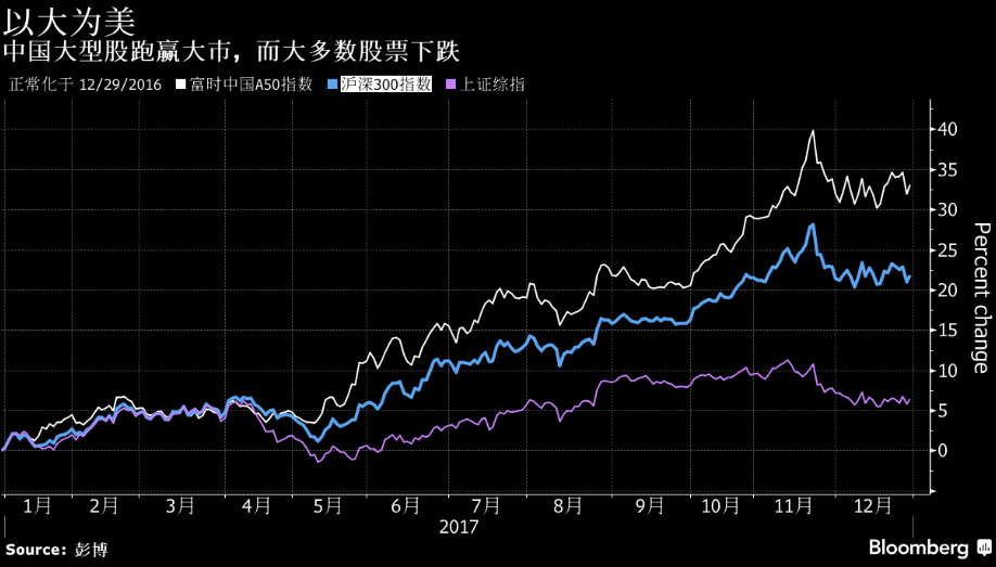 中国接近排行榜的底部。中国政府降低金融领域风险的举措给股市带来了冲击,上证综合指数仅上涨了6.2%。投资者在大型国企抱团取暖,导致这类上市公司与大盘之间的分化创下历史纪录。