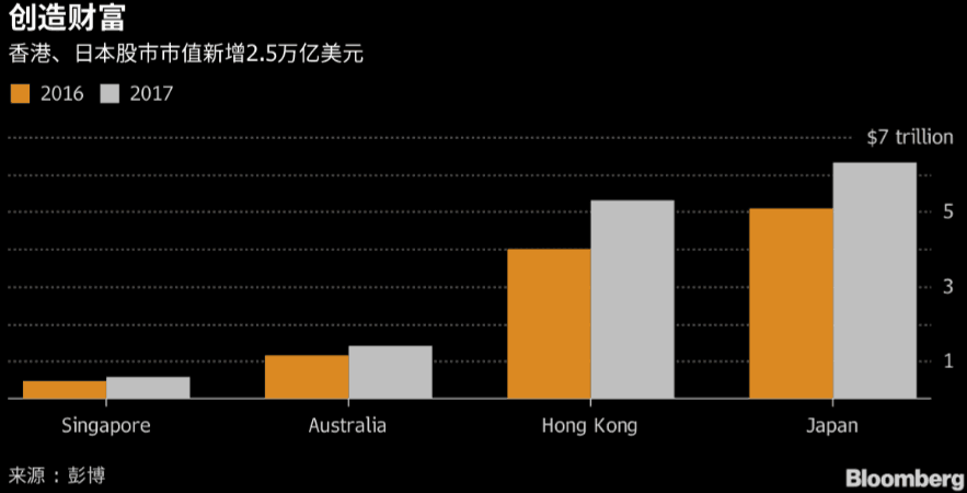 如果按照为股东创造的财富为标准,那么排在榜首的则是香港和日本,其新增市值总计高达2.5万亿美元。