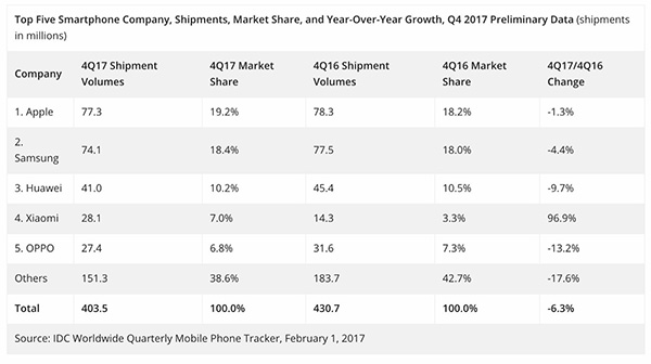 2月2日,市场研究公司IDC于发布报告称,在2017年第四季度,苹果超越三星成为全球智能手机销量之王。在2017年前三个季度,三星都是领导者。在苹果、三星之后紧接着的、是华为、小米和OPPO三家中国公司。