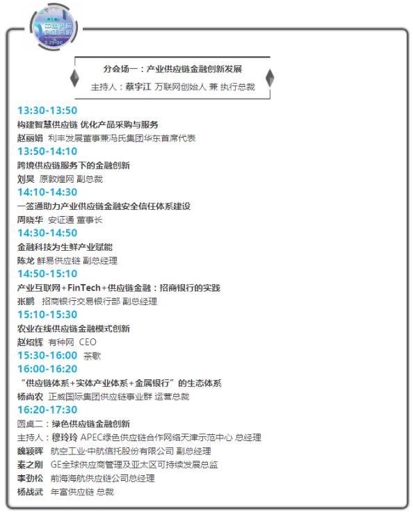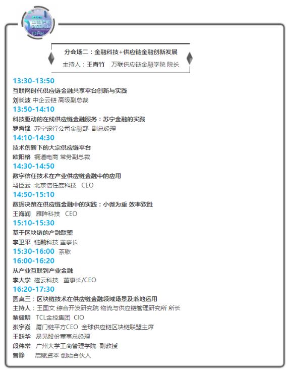 论坛当天将以主论坛+分论坛、圆桌会等多种形式组合展现。通过高端演讲、尖峰对话等多模式实现信息共享,致力打造最具丰富性和影响力的中国供应链金融行业峰会。其中,分会场一将以“产业供应链金融创新发展”为主题, 探讨产业供应链网络服务平台搭建、构建绿色供应链新场景、配套新金融、医药流通中的供应链金融创新、构建社会资本流入实体经济大通道等多个话题。分会场二将以“金融科技+供应链金融创新发展”为主题,探讨大数据+人工智能驱动商业变革与供应链金融创新、物联网助力汽车领域供应链金融风控、区块链助力挖掘优质资产与激活金融生态等多个前沿话题。