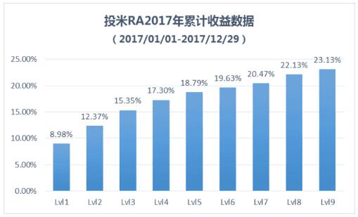 宜信财富投米RA通过智能算法优化配置全球ETF投资组合(注:ETF即交易型开放式指数基金),这些ETF投资组合分别追踪美国、中国、其他发达国家和发展中国家的股票、债券、房地产市场等相关指数,实现了跨地域国别、跨资产类别的全球化资产配置,这样某个国家、某个行业的兴衰将不会对指数带来显著影响,从而为投资者带来长期稳健、风险可控的收益。而其不久前发布的2017年度业绩报告也成为其“风险可控、收益可期”投资理念的最好佐证。据业绩报告显示,在2017年全球资本市场跌宕起伏,地缘政治风险上行的背景下,宜信财富投米RA依然为投资人获取了8.98%——23.13%的稳健收益。从全年的收益数据来看,除了风险组合1,其余8种风险组合的累计收益均达到了12%以上,风险组合9收益率更是高达23.13%。