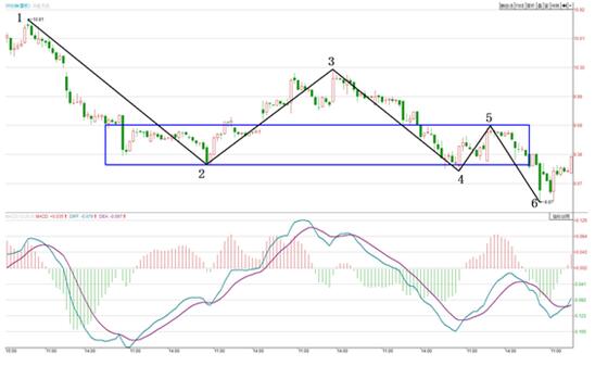 4.从30分钟级别来看,日线级别的8-9号点下跌一笔就是30分钟级别1-6号点的下跌一段,而从走势中可以明显发现,这里的2-5号点三笔构建了一个明显的下跌中枢,并且1-2号点与5-6号点相比出现了明显背驰的走势。