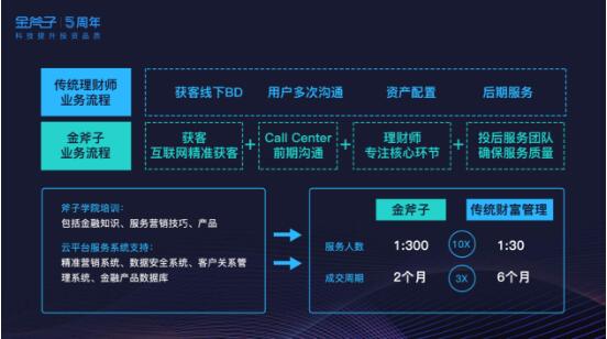 不难看出,在传统人工服务逐渐受到人工智能冲击的当下,理财师群体本身也亟需跟上时代步伐,而金斧子的六重科技赋能恰好为理财师提供了全新的发展通道。相比传统理财师的业务流程,90%的时间浪费在打陌生电话获客、前期沟通、售后处理工作上,金斧子理财师可以将几乎所有精力专注于核心的需求挖掘、资产配置、深度关系环节,单个理财师服务的客户资产规模提升10倍,而便捷的在线交易系统大幅优化了销售流程,促成交易的平均时间缩短了2/3。在金斧子现有理财师队伍中,有不少来自券商、银行、保险的传统理财师,他们服务高净值用户的数量巨增,同时还可以更加深入挖掘高净值客户更高层次的资产配置需求,最后个人收入也可望从40万突破100万以上。