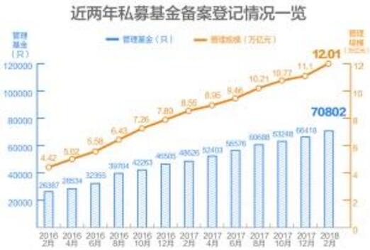 私募行业,正是大类资产中成长最快的板块。根据中国基金业协会的数据,2月底,私募基金总规模突破了12万亿元,相比两年前增长了172%,创造了新的历史记录。同时,私募备案基金数量超出7万只,已登记私募管理人数量为2.31万家,私募员工总数达到24.21万人,两年间私募发展进入快车道。股权创投私募继续保持快速增长,规模达7.27万亿,证券私募受市场影响规模略减,为2.60万亿,百亿级大型私募机构为210家。
