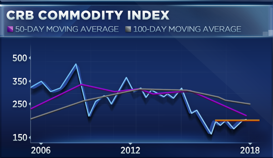 图注1:CRB大宗商品指数走势图(2016-2018)。紫色线条代表50日均线,灰色线条代表100日均线