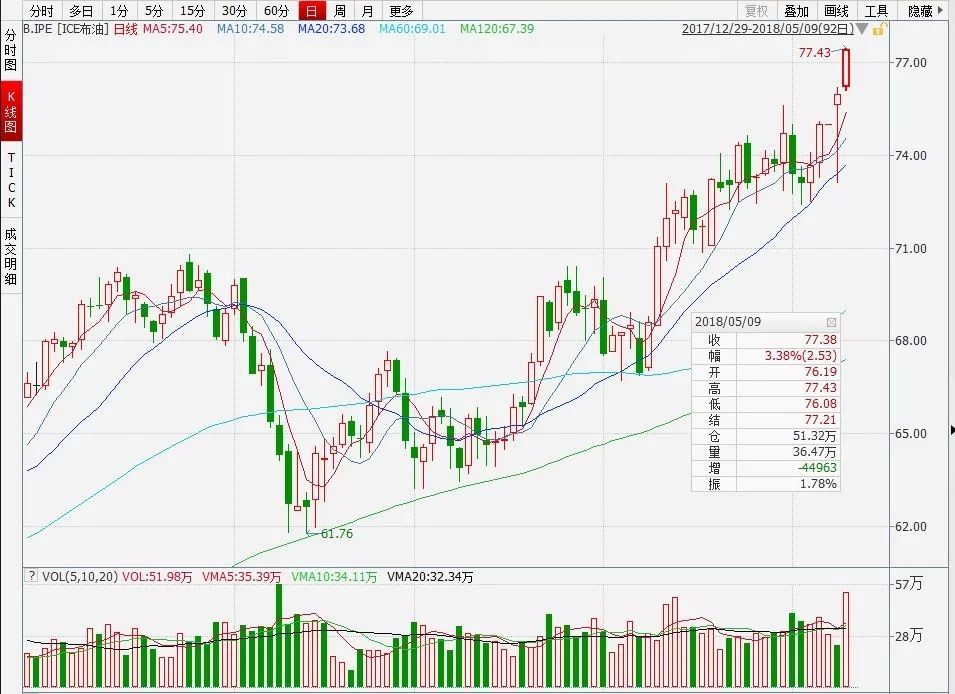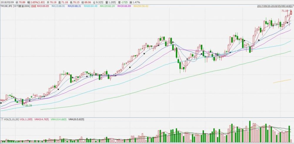 不过也有机构对此持谨慎态度,认为下跌即将来临。早在5月7日,尚处于美国夜盘时间的美国原油价格突现异动,在交投并不活跃的情况下,一举突破70美元的“天花板”,继而刷新4年新高至70.69美元。与此同时,伴随着伊核协议被撤出消息落实,国际油价止跌回升。5月9日又大幅突破71美元/桶。
