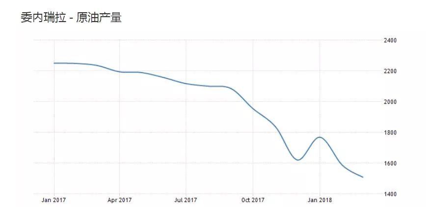 OPEC数据显示,2018年第一季度委内瑞拉的原油产量已经下降至平均154万桶/日,较之2017年第四季度的平均177万桶/日出现明显的下降,且这一趋势还在加剧。一些银行预计,委内瑞拉的产量将很快跌至120万桶/日,同时今年年底很有可能会跌至100万桶/日。