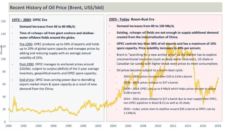 纵观百年油价变动,1930-1970年代美国掌握了全球石油库剩余产能40%,牢牢稳定了油价,1970年代开始,OPEC接过了石油产量话语权,产量占全球50%,同时控制全球约20%以上 闲置库存,这期间石油价格有起伏,但总体在20美元-40美元之间变动,一直到2000年开始,中国开始大举进行城镇化建设,石油需求剧增,加上新能源技术飞速发展,OPEC石油出口产量占全球30%以下,剩余产能不足10%,国际油价开始剧烈波动。