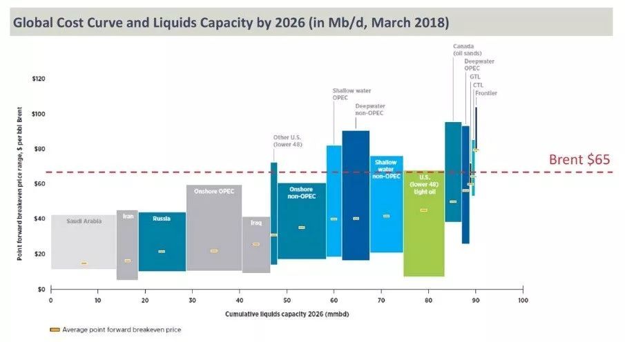 根据老牌能源研究机构Wood Mackenzie报告,油价在65美元附近所有石油生产商都有的赚,其中沙特、伊朗、俄罗斯等产油大国的盈亏平衡价(breakeven price)最低,只要油价不跌破20美元,就不会亏本,当然也不会赚。
