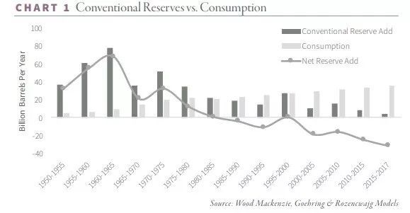 根据EIA的测算,2018年全球将消费365亿桶原油,但是2017年传统能源(包括液体石油和天然气)新增产量只有67亿桶,而且基本呈逐年下降趋势。