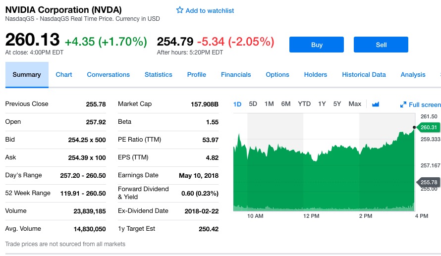 英伟达周四在纳斯达克交易所的开盘价为257.92美元。截至周四收盘,英伟达股价上涨4.35美元,报收于260.13美元,涨幅为1.70%。截至美国东部时间周四17:20分(北京时间周五5:20分),英伟达股价在盘后交易中下跌5.34美元至254.79美元,跌幅为2.05%。过去52周,英伟达股价最高为260.50美元,最低为119.91美元。