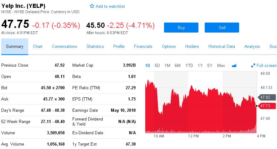 今天常规交易中,Yelp开盘价为48.11美元,下跌0.17美元,跌幅为0.35%,报收于47.75美元。盘后交易中,Yelp股价一度下跌2.25美元,跌幅达到4.71%。过去52周,Yelp股价最高为48.4美元,最低为27.11美元。