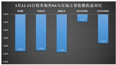 3月22-23日两天累计宜信财富投米RA美元资产组合跌幅最小和最大的风险组合与美股主要指数收益对比