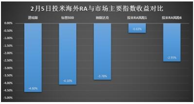 2月5日当天宜信财富投米RA美元资产组合跌幅最小和最大的风险组合与美股主要指数收益对比