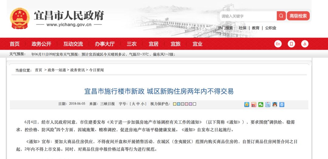 6月3日深夜,湖北宜昌下发《关于进一步加强房地产市场调控有关工作的通知》,明确宣布:自本通知施行后,在城区(含夷陵区)范围内购买商品住房的,自签订商品住房网签合同之日起,2年内不得上市交易。