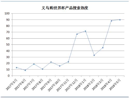 从义乌购平台上世界杯相关产品的搜索热度来看,世界杯产品的采购热度从2017年12月份大幅开始上涨。2018年2月份因为中国的农历新年,义乌市场经营户春节放假,采购热度下降,3月份到5月份持续攀高,5月份达到最高峰,直到6月份世界各地的采购补货还在不断。根据世界杯相关产品关键词的搜索频率我们可以看到,2018年上半年世界杯相关产品的采购热度比2017年下半年的采购热度增加了一倍多。