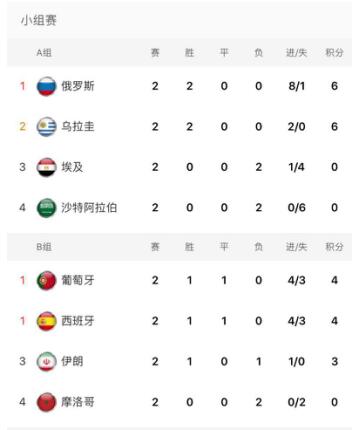 世界杯小组赛第二轮行至将半,开场4分钟即被破门的摩洛哥队成为首支确定淘汰的队伍。与摩洛哥的悲情落幕相比,葡萄牙则再次在C罗的进攻下进入胜利的狂欢,C罗也用实力在世界杯的舞台上证明了他是当今最强悍的球员之一。几个小时后,西班牙也以1:0战胜伊朗队。B组里葡萄牙与西班牙以4个积分,进4球失3球,齐头并进。