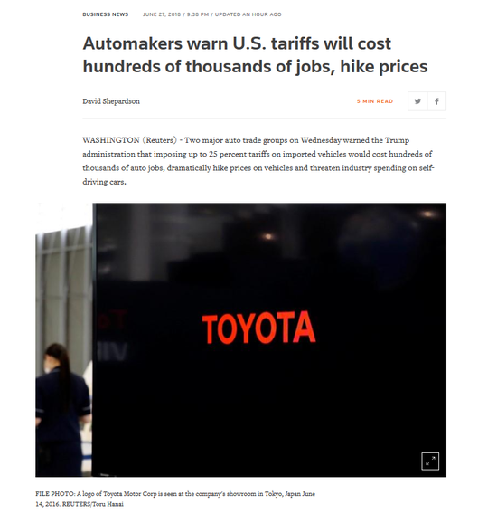 汽车制造商联盟警告美国 加征关税的代价是数十万人失业