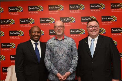 从左至右:南非旅游局首席执行官Sisa Ntshona先生、南非国家旅游部部长Derek Hanekom先生、南非旅游局亚太区总裁白文博先生,在现场接受媒体采访。