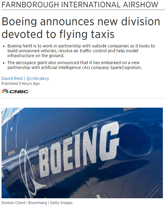 波音公司首席技术官格雷格·希斯洛普星期二在法恩博罗国际航展上说,波音公司拥有安全有效地设计新技术的专业知识。“这些无人驾驶飞行器的开发工作将在未来几年时间里进行。交通运输必须是多模式的。”希斯洛普说道。“我们创立Boeing NeXt部门的想法是,既然存在这么一个新兴市场,我们就该建立这个部门以解决开发相关技术的问题。”