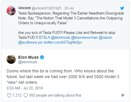 马斯克在周四晚上的推文中说道,“不知道这些谣言是从哪来的。”他夸口说,如果说有什么区别的话,那就是在前一周,特斯拉收到了5000份Models 3的新订单,还有2000份老款Mode S和Model X的订单。