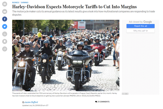 哈雷公司周二公布的业绩,是跨国公司如何应对贸易争端和关税的最新进展。哈雷公司在美国大型摩托车市场的份额在第二季度从第一季度的50.4%下滑至48.4%。特朗普和工会官员批评了哈雷戴维森公司的举动,称该公司正背叛其“美国制造”的形象。