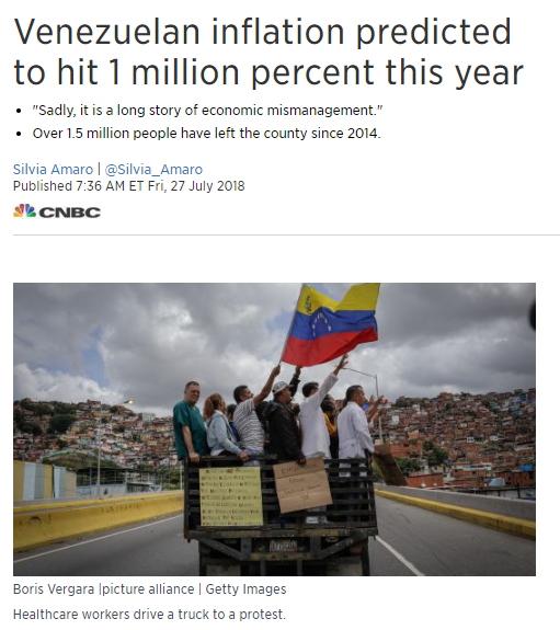 国际货币基金组织(IMF)本周表示,委内瑞拉当前处于严重的经济和社会危机,并认为该国通胀水平将在今年年底突破百万个百分点。IMF将委内瑞拉当前处境与1923年的德国,以及20世纪后期津巴布韦的情况进行了对比,其中货币需求的崩溃导致了商品价格过高和戏剧性的社会问题。