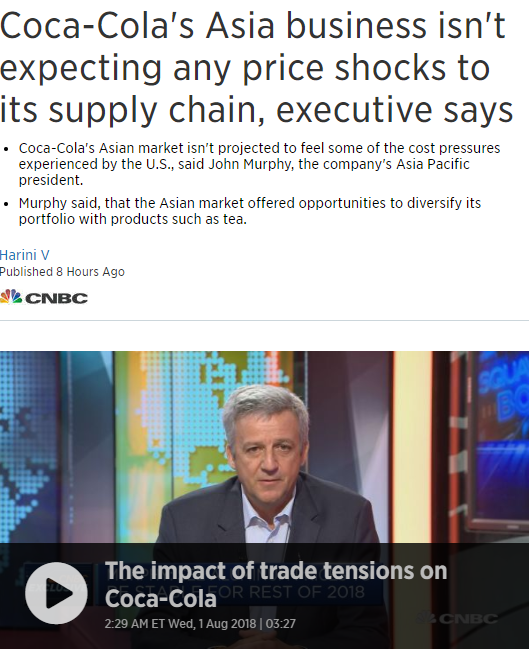 可口可乐首席执行官兼总裁詹姆斯·昆西上周告诉CNBC,该公司正面临成本压力,部分原因是美国总统特朗普对钢铁和铝征收关税。在这一评论之前,可口可乐宣布其第二季度的营收和利润好于预期,这是因为可口可乐努力将其膳食饮料带到世界各地。