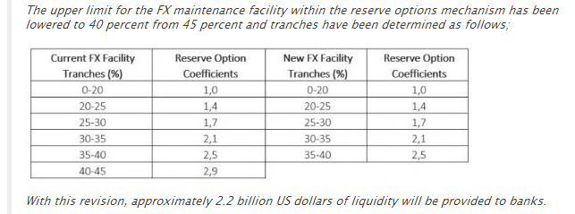 根据土耳其央行网站声明,决定调整外汇稳定准备金机制(FX maintenance facility within the reserve options mechanism),将外汇缴存比例上限由45%降至40%,差别折算系数(reserve operation coefficients, ROC)暂时保持不变。预计将为市场带来22亿美元的外汇流动性。