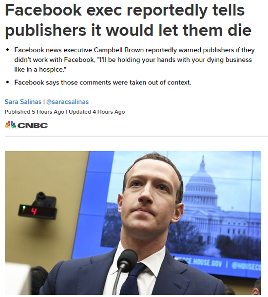 据报道,Facebook新闻主管坎贝尔·布朗最近警告发布商,如果他们不与这家社交媒体巨头合作,“我将像临终关怀一样照顾着你的垂死业务,”几家新闻网站引用了最初的报道。Facebook发言人在一份声明称,这些评论是“断章取义”。