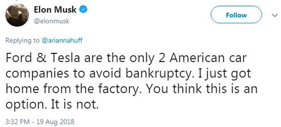 不过,马斯克在推文中对这封公开信进行了回应,称能避免破产的两家美国汽车公司只有福特汽车和特斯拉。