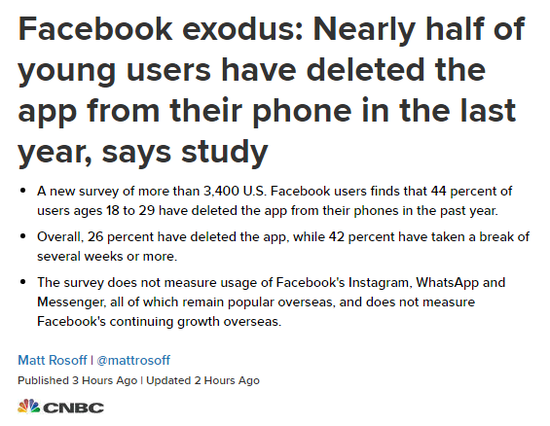 皮尤在5月和6月对3400余名Facebook用户进行了调查,结果发现在18岁到29岁的美国用户中,44%称其已在过去一年时间里卸载了Facebook应用。不过,其中一部分用户随后又重新安装了该应用。