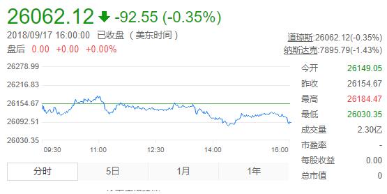 环球财经网讯 北京时间9月18日消息 截至周一收盘,特朗普表示将在盘后宣布最新贸易措施,美国三大股指集体收跌,纳指跌1.4%。科技股领跌。截至收盘,道指跌0.35%,报26062.12点;纳指跌1.43%,报7895.79点;标普500指数跌0.56%,报2888.8点。