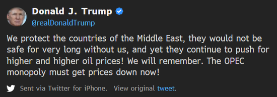 周四早间,特朗普在推特上表示OPEC这个垄断组织“现在必须降价!”特朗普在推特上表示:“我们保护了中东国家,如果没有我们,他们就没有长治久安,但他们继续推动油价越来越高!我们会记住。”