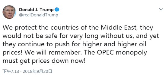 本周四,就在OPEC即将举行会议之际,特朗普在推特上表示,“OPEC垄断势力现在必须降价!”