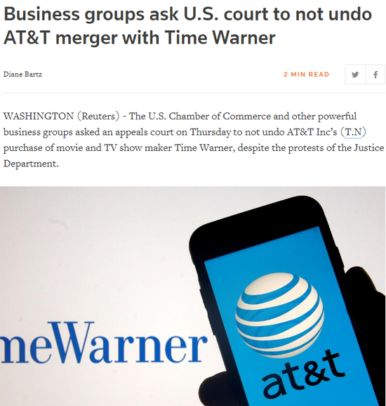 美国商会认为,停止AT&T和时代华纳的合并可能危害到大量通常有利于消费者的交易。