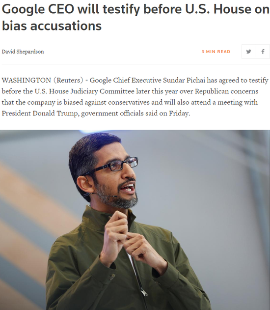 谷歌CEO将出席美众议院听证会 讨论是否人为操控搜索