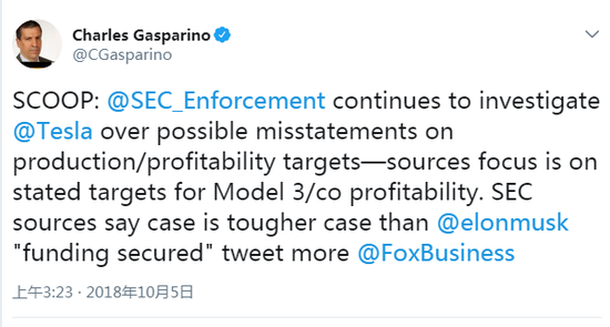 周四美股午盘时间,福克斯新闻的记者Gasparino发推文称,在可能存在错误的产量/盈利目标声明上,SEC还在调查特斯拉。调查重点是特斯拉公布的Model 3生产和公司盈利目标。SEC的消息人士称,这个案子将比特斯拉CEO马斯克发表特斯拉私有化资金来源有保障的推文一案更麻烦。