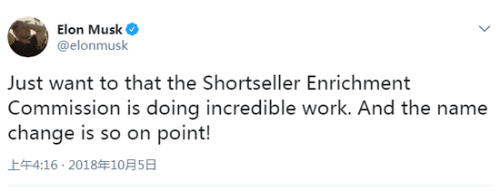 环球财经网讯 北京时间10月5日,就在对证券欺诈案和解不久后,特斯拉CEO马斯克周四在一条推文中嘲讽美国证监会,称其为“喂肥空头的委员会(Shortseller Enrichment Commission)”