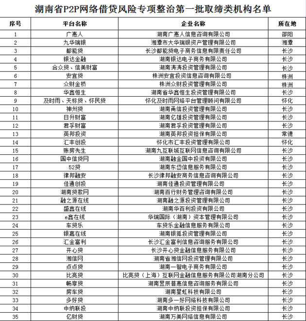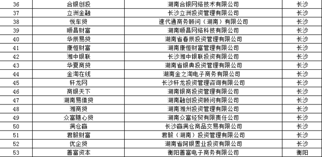 11月7日,湖南省地方金融监督管理局发布公告称,按照国家关于互联网金融风险专项整治及P2P网贷风险专项整治的有关要求,为进一步推进我省P2P网贷风险专项整治工作,完成存量风险化解,经省P2P网贷整治办会同公安、工商、人民银行等部门共同研究认定,并报省互联网金融风险专项整治工作领导小组批准,已确定第一批取缔类P2P网贷机构53家(名单附后)。