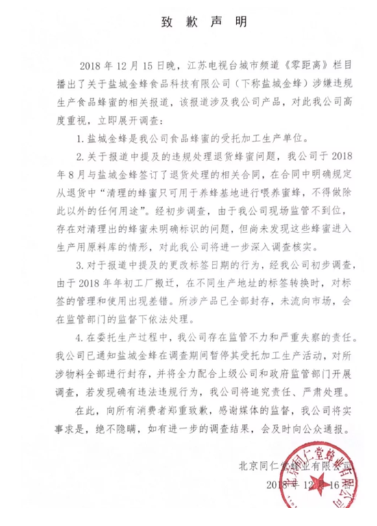 12月15日晚,江苏电视台城市频道《零距离》栏目播出了关于盐城金蜂食品科技有限公司(下称盐城金蜂)涉嫌违规生产食品蜂蜜的相关报道,对此,北京同仁堂股份有限公司回应称涉及产品已全部封存。